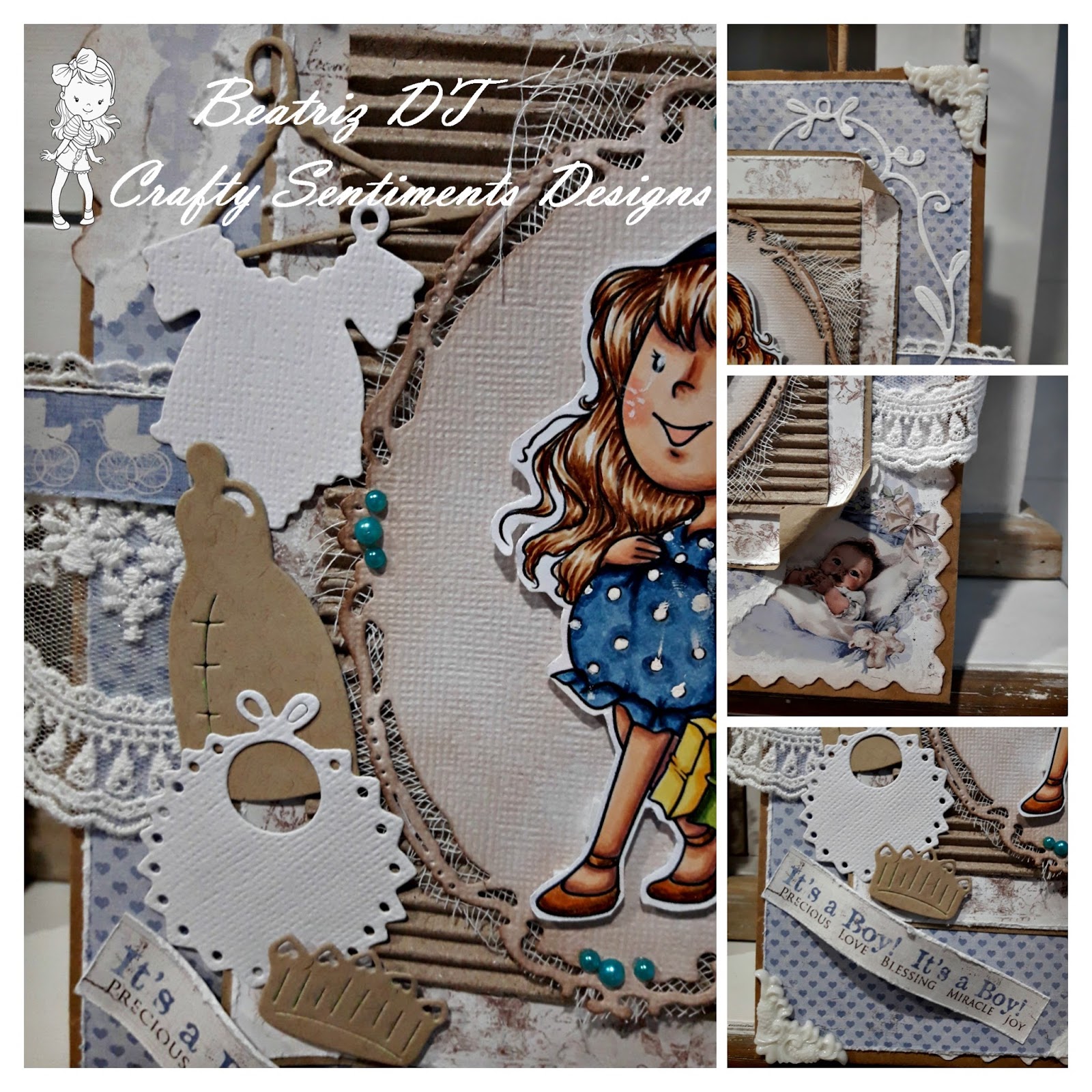 Los troqueles utilizados para decorar son del DooHickey vol 13 "sweet pea" en cartulina texturizada blanca y cartulina kraft. La cenefa de cochecitos de bebé y el sentimiento son de la colección "Vintage Baby"